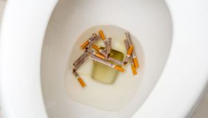 Perhatikan ini merupakan kebiasaan kaum laki – laki yang biasanya suka merokok di toilet dan membuangnya begitu saja di lubang WC. Putung rokok merupakan salah satu benda yang terlarang untuk dibuang ke dalam WC, diharapkan kedepanya jangan sampai Anda membuang benda kecil tersebut ke dalam lubang WC, memang sih kesannya remeh ukuran putung rokok bahkan tidak lebih dari seruas jari. Terlebih putung rokok juga mudah hancur. Tapi yang jadi masalah adalah jika putung rokok jatuh ke dalam WC justru akan meracuni air resapan. Bahan kimia yang terkandung dalam rokok akan jadi polusi pada air resapan.